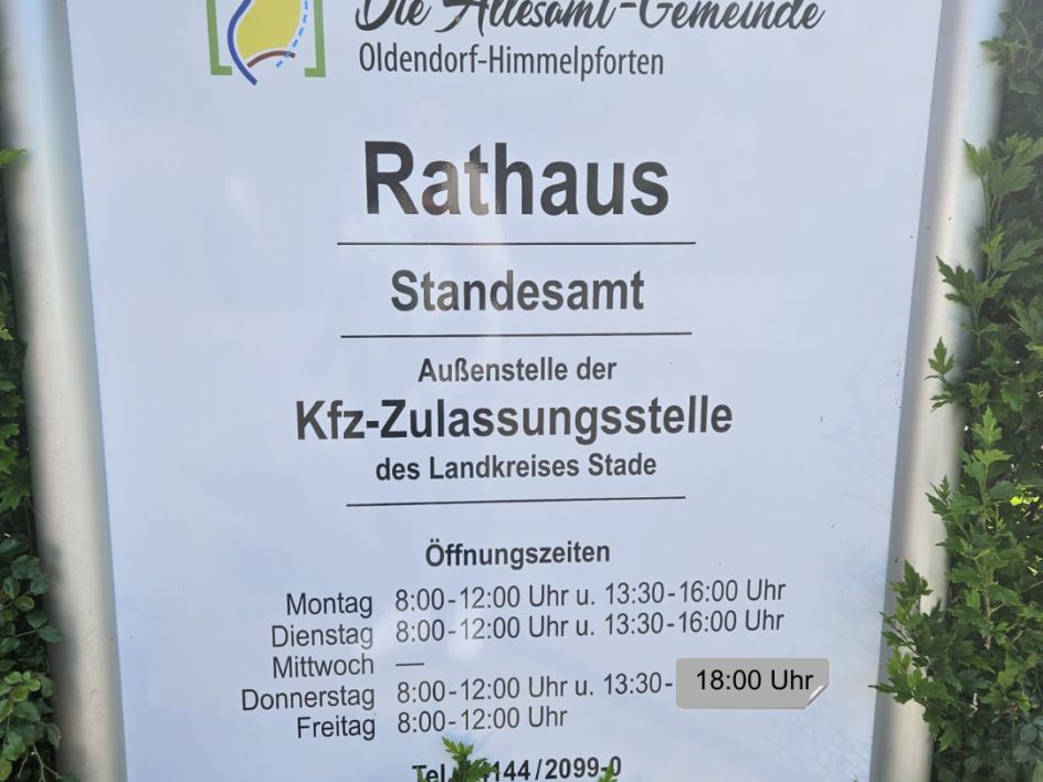 Die aktuellen Öffnungszeiten von Rathaus Himmelpforten und Bürgerhaus Oldendorf: